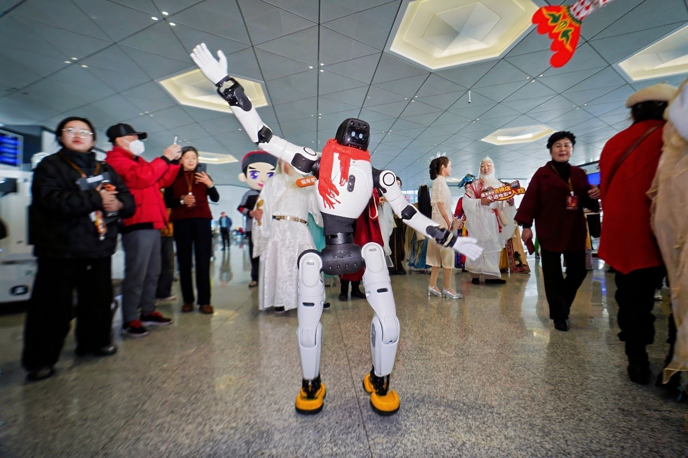 当天,苏州南站候车大厅一派热闹景象——古风装扮的演员穿行于旅客之间,笑意盈盈地邀请合影、互动打卡;智能机器人、机器狗组成“科技萌团”,灵动穿梭,与演员联袂演绎创意快闪。为服务好此次团体旅客出游,苏州南站在进站口设置了清晰的指引标识,增设票务服务窗口,增开安检仪及安检通道,开辟旅游列车候车专区,实现旅客从进站、候车到登车的“无缝衔接”。